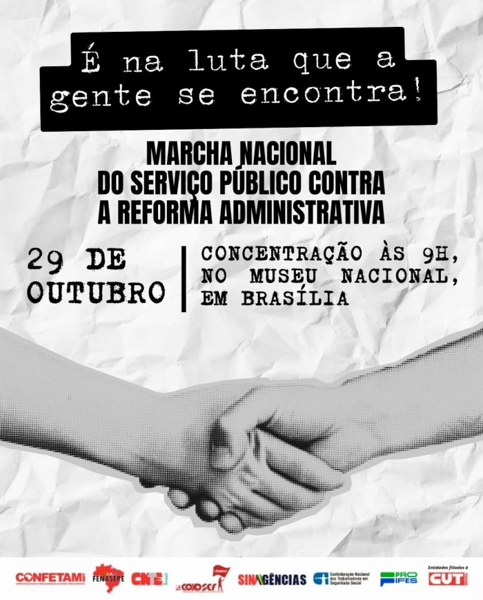 A CNTSS/CUT, unificada com as demais entidades nacionais do setor público da CUT — municipais, estaduais e federais —, mantém seu posicionamento firme de combate a essa proposta. Dessa forma, reafirmou junto às suas entidades filiadas a orientação de manter firme a estratégia de mobilização em seus estados e junto à agenda da CUT, com o objetivo de ampliar o diálogo com a classe trabalhadora, a sociedade e os parlamentares. Dentre os destaques da pauta da CUT para este período está a “Marcha Nacional do Serviço Público contra a Reforma Administrativa”, em 29 de outubro, que acontecerá em Brasília. A Confederação entende que somente com mobilizações massivas nas ruas, em defesa do serviço público, dos direitos e da democracia, será possível derrubar essa nova proposta de Reforma Administrativa.